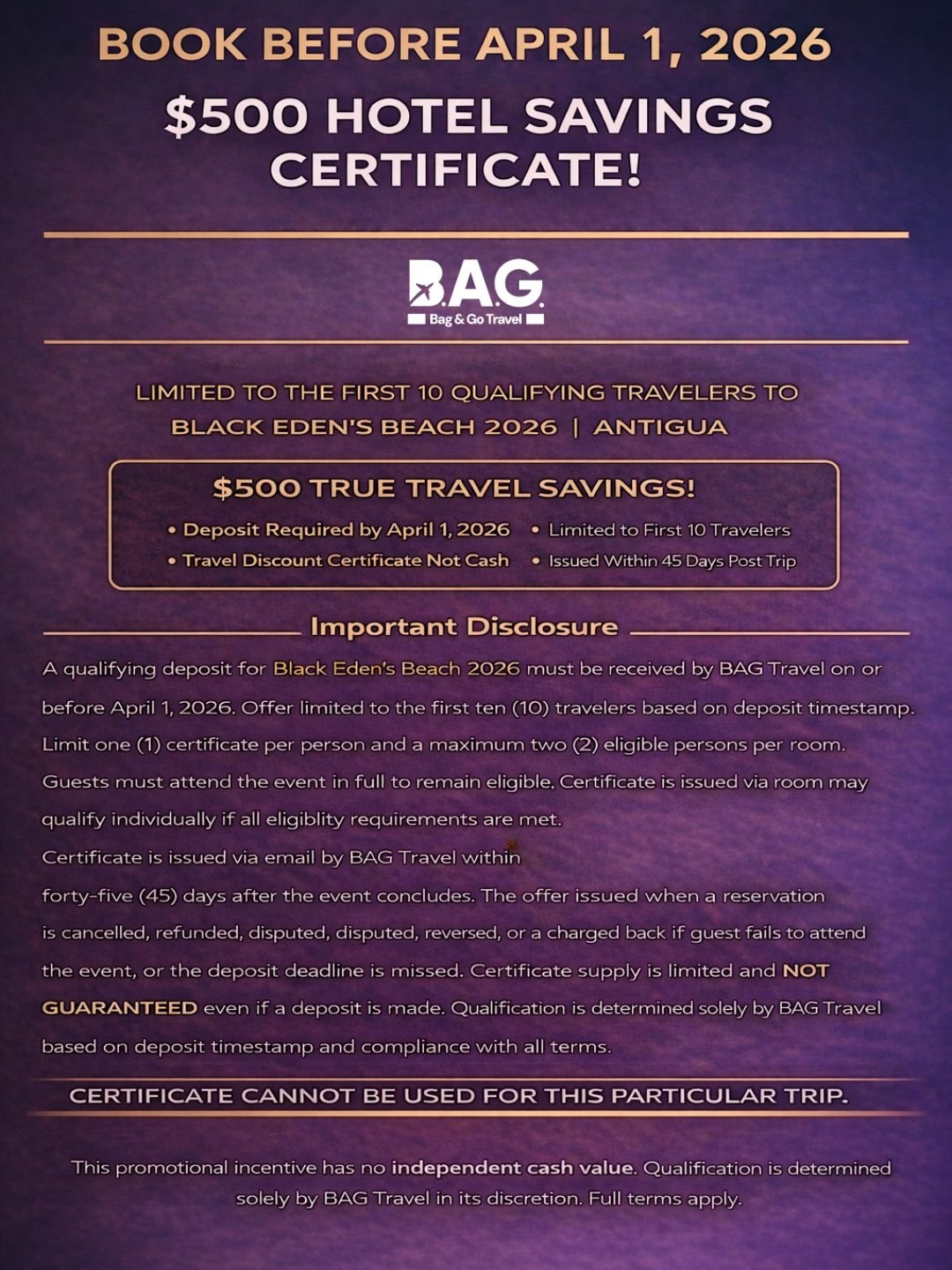 Reserve your spot before April 1 and you may also receive a $500 Hotel Discount Certificate* for a future getaway.