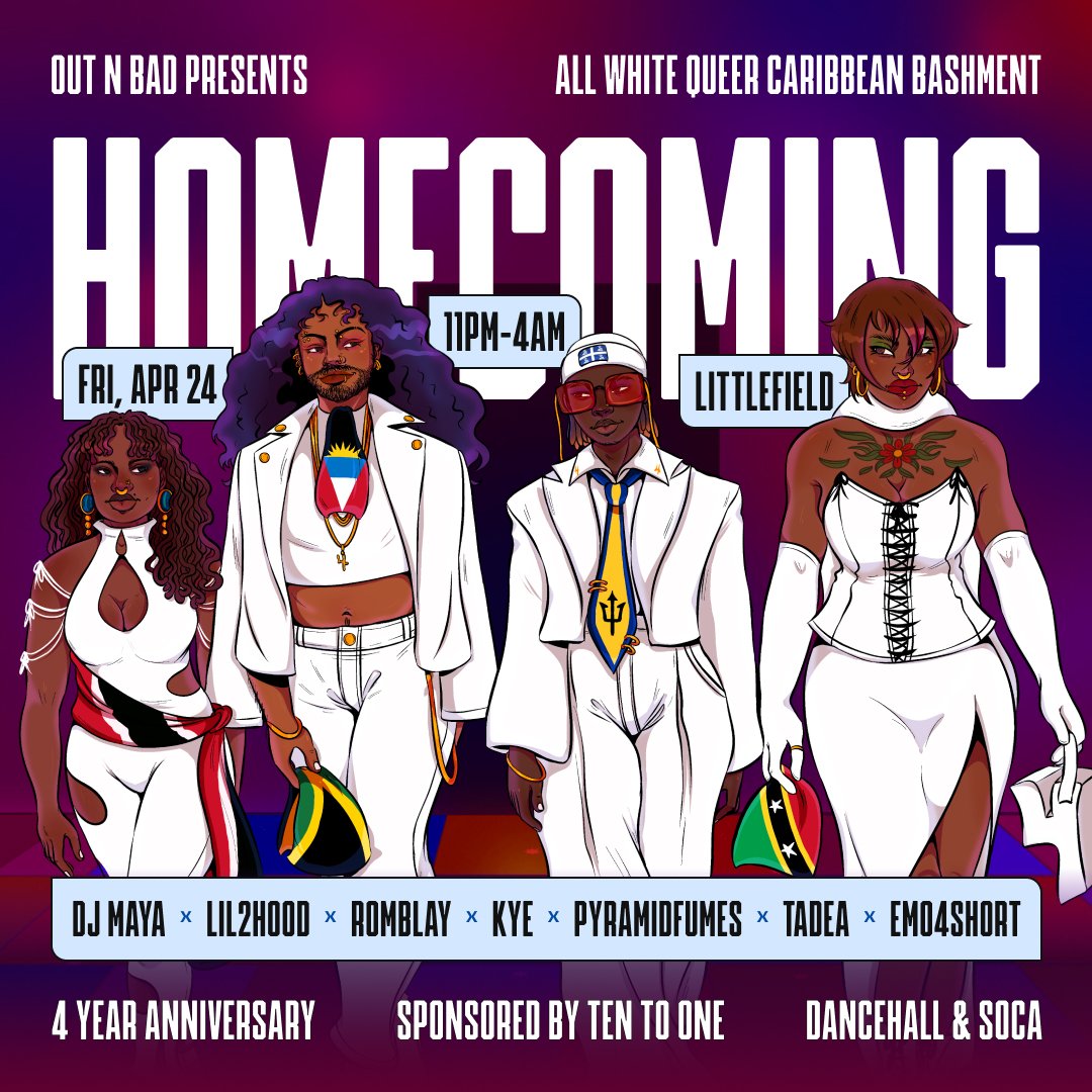 On Fri, April 24th from 11pmโ4am at Littlefield, weโre celebrating with Out N Bad: HOMECOMING โ our annual All White Anniversary Bashment. ๐ค๐๐ฎโ๐จ๐๐พ๐ฅ