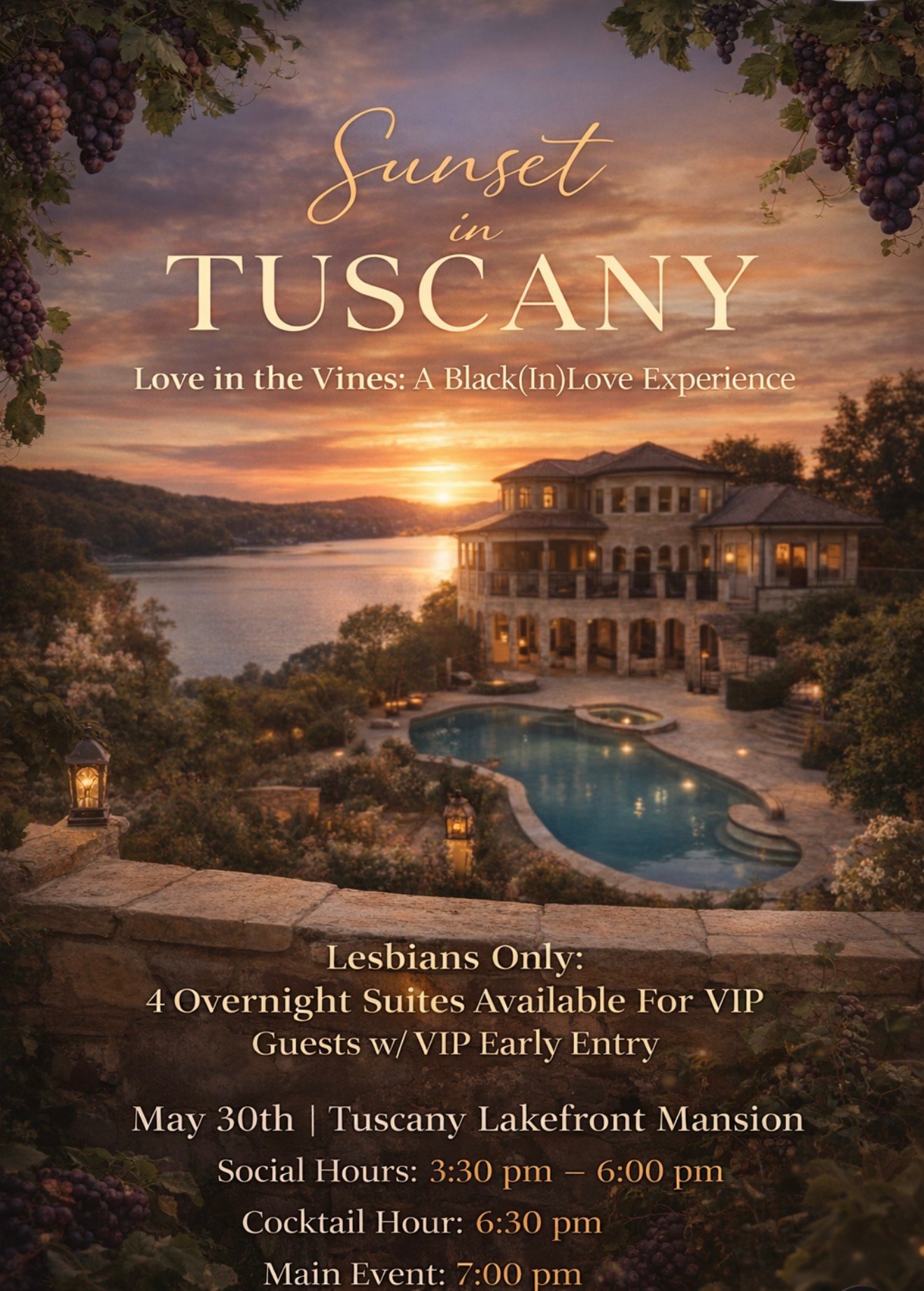On May 30th, Black(In)Love invites you to an exclusive, one-of-a-kind experience set inside a breathtaking Tuscan-style lakefront estate. Surrounded by water, nature, and timeless architecture, guests will be immersed in an atmosphere of romance, intention, and elevated connection from the very first pour.